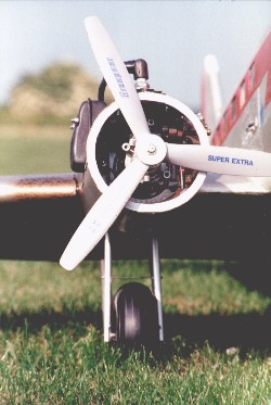 . Wingspan: 3 m Weight: 17 kg Engines: 2x Zenoah 22,5 ccm Tank: 1 ltr Props: Graupner Three-Blade 36-18 / 14-7 Additional function: - Landing gear - Light on / off - Switch for single motor-control left / right RC: Multiplex + Graupner Servos: 14 Receiver: 2 Lighting: max. 33,6 Watts Batterypower for control: -1x 6V / 4 Ah -1x 6V / 1,7 Ah Batterypower for light: -1x 6V / 4Ah / 24 W |